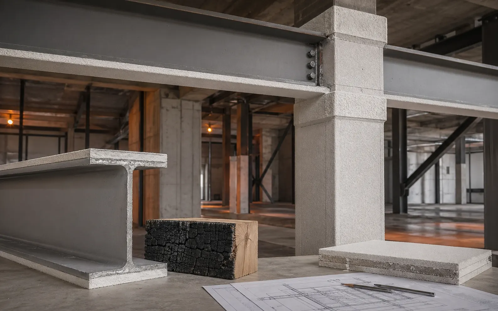 Beton verliest stijfheid en sterkte boven 300 °C en kan bij snelle opwarming spalling vertonen. EC2-1-2 levert vereenvoudigde tabelmethoden voor wapeningsdekking en doorsnedematen om R 30 tot R 240 te bereiken. Voor staal vermindert de vloeispanning sterk vanaf 400 °C; EC3-1-2 maakt het mogelijk om de kritieke staaltemperatuur te koppelen aan de aanwendingsgraad μfi.