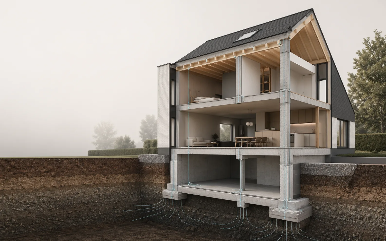 In veel projecten worden stabiliteit en fundering sequentieel behandeld: eerst een draagstructuur, daarna een funderingsadvies, en pas later een uitvoeringsdetail. Dat lijkt efficiënt, maar het verbergt de belangrijkste koppeling. De fundering ontvangt geen abstracte belasting, maar het resultaat van een volledig structureel systeem met eigen stijfheden, herverdelingsmogelijkheden en uitvoeringsbeperkingen.