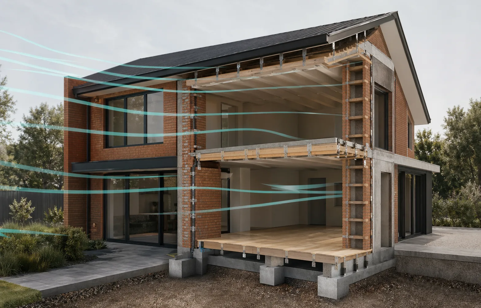 Een correct stabiliteitsontwerp koppelt daarom bovenbouw en fundering. Het controleert niet alleen de wandcapaciteit, maar ook de verankering, funderingsdruk, eventuele trek, globale schuifweerstand en vervormbaarheid van de ondergrond.