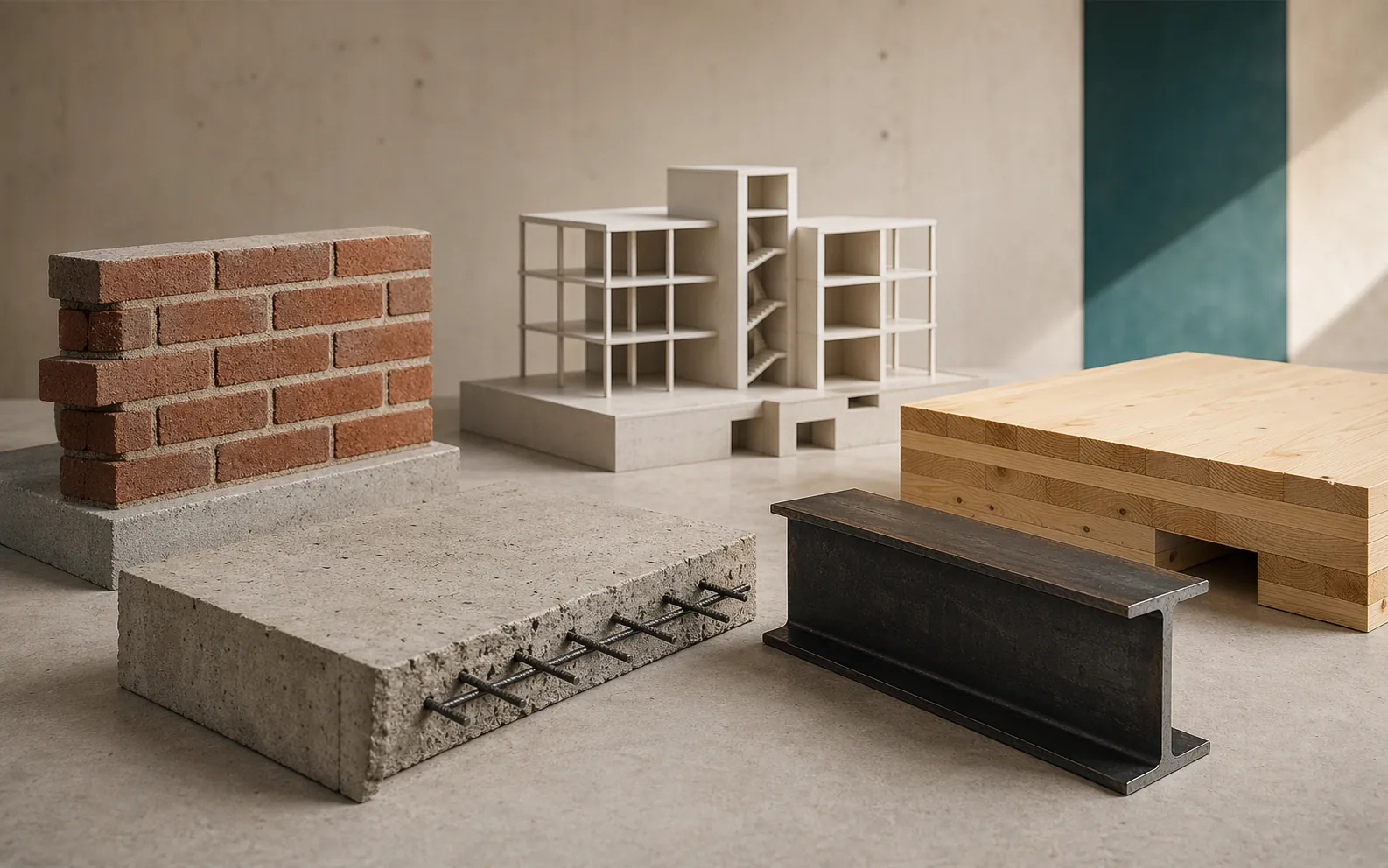 De meest bruikbare materiaalstudie vergelijkt geen abstracte materialen, maar specifieke ontwerpschema’s: wanddragend metselwerk, betonvloer met onderslagen, staalportaal, houten dakstructuur, hybride vloer of kernoplossing. Per schema worden hoogte, kost, uitvoering, risico, afwerking, brand, akoestiek en fundering naast elkaar gezet.