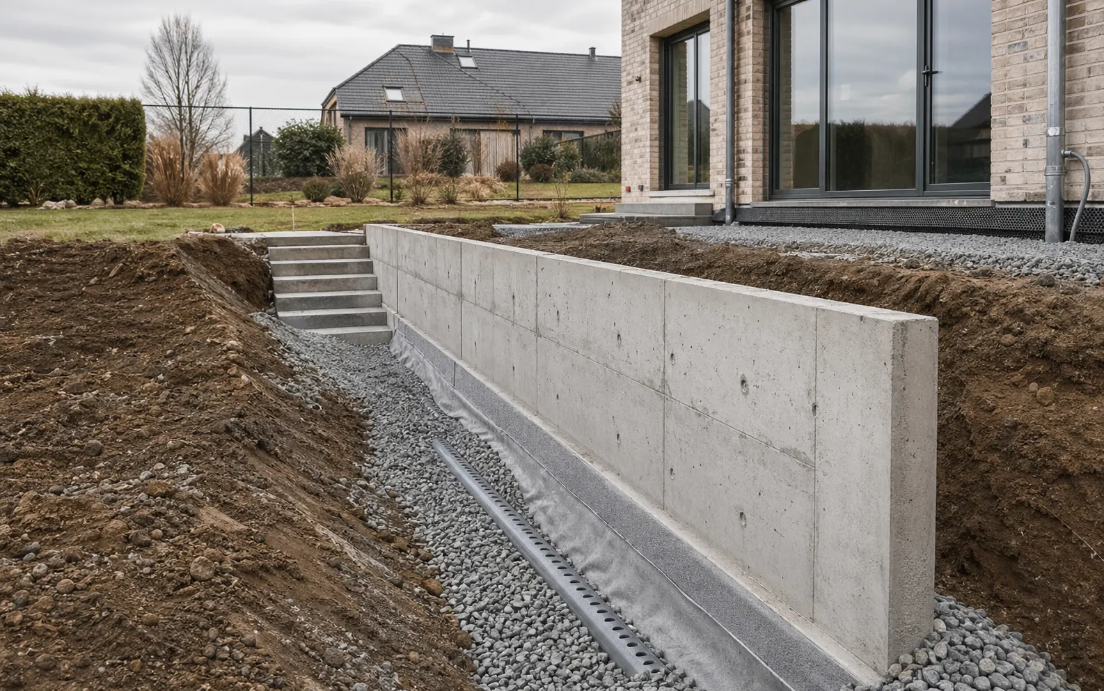 Voor steunmuren naast bestaande gebouwen kan een gefaseerde uitvoering met onderschoeiing of micropalen nodig zijn om bestaande funderingen te beschermen. De Buildwise-publicatie over onderschoeien blijft hier een nuttige referentie voor de uitvoeringsaanpak.